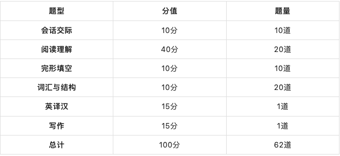 河北地區(qū)學(xué)位英語2022年下半年考試新增了完形填空題型,目前試卷共6個題型包括會話交際、閱讀理解、完形填空、詞匯和語法、英譯漢和短文寫作。